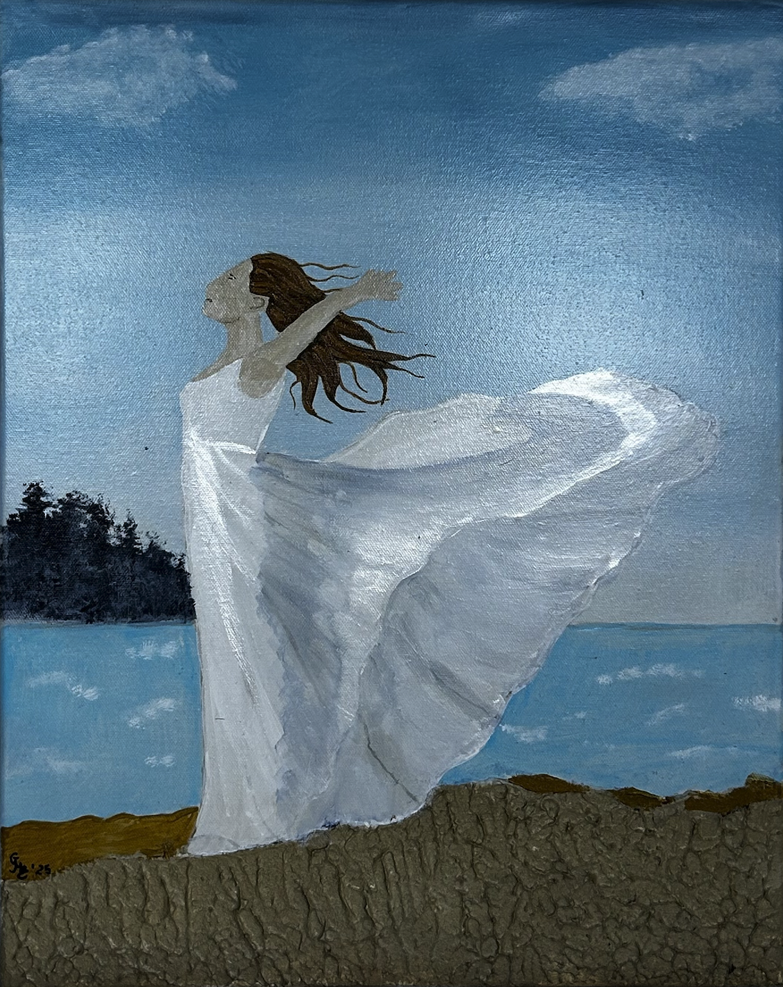 At the meeting of sky and sea, she stands as a quiet guardian of the threshold. Here the Seeker learns to listen—to the wind, the tide, and the gentle voice of the soul. In this stillness, truth rises like breath and guides the heart back to its luminous center. The journey begins not with striving, but with listening.